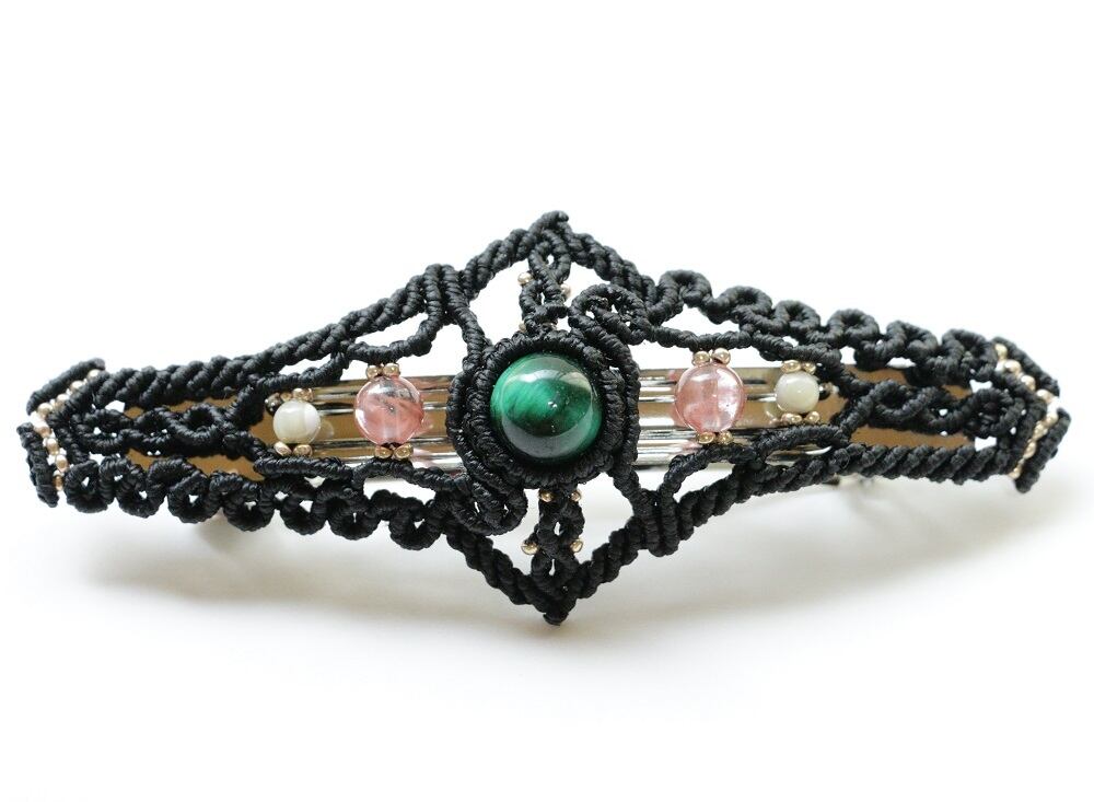 そんなグリーンタイガーアイをメインに、シックな黒色でバレッタを編んでみました。大きめのバレッタなので、髪を縛ったゴム紐を隠すときにも!黒いマクラメ糸は、シックな服装にとてもよく合います。落ち着いたおしゃれをする時のワンポイントにも!