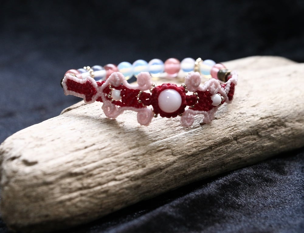 そんなピンクオパールをメインに据えて、マザーオブパールとチェリークオーツをサブに取り入れたブレスレットです。赤とピンクをメインカラーに、丸みを意識したデザインに仕上げてみました。お守りのように、普段何気なく着けていると、ピンクオパールの美容効果が表れてくるかもしれませんよ?