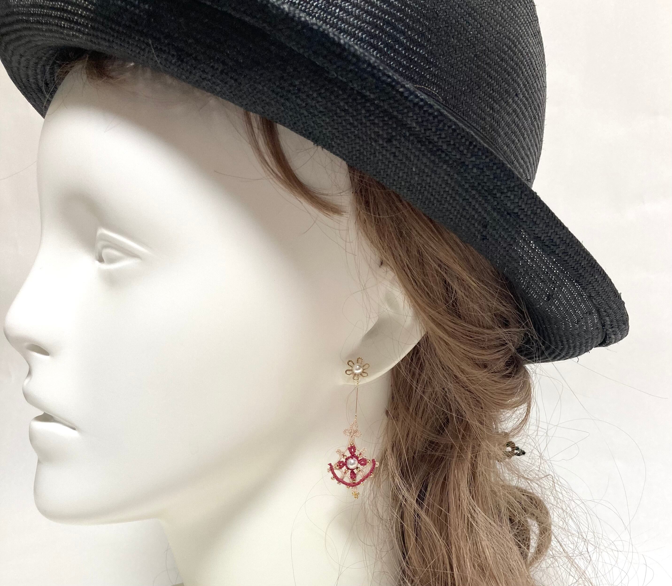 星をモチーフにしたタティングレースに金色ビーズを散りばめ、フェイクパールをメインに据えたピアスです。
